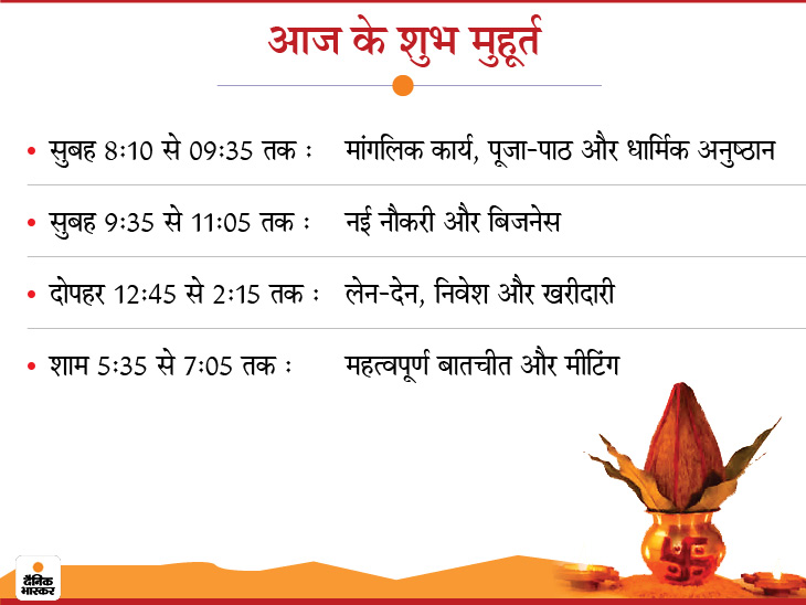 आज तिथि और नक्षत्रों की स्थिति को देखा जाए तो दिन में जरूरी और शुभ काम करने के लिए 3 शुभ मुहूर्त रहेंगे। अभिजित और विजय मुहूर्त दिन में रहेंगे। हालांकि अमृतकाल भी शुभ मुहूर्त होता है लेकिन रात में होने से इस दौरान काम नहीं किए जा सकेंगे। इसके अलावा शाम को गोधुलि मुहूर्त में भी शुभ काम किए जा सकते हैं।
