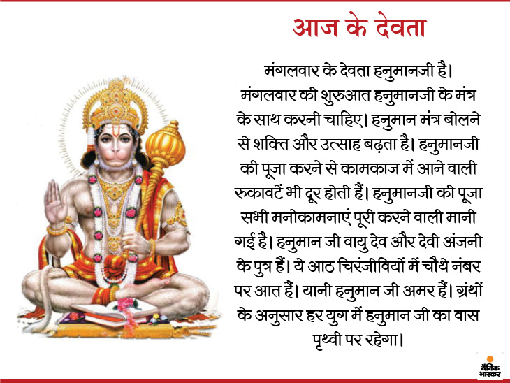 मंगलवार को सुंदरकांड का पाठ करने से दुश्मनों पर जीत मिलती है। रामचरित मानस में सुंदरकांड ही एकमात्र ऐसा अध्याय है जिसमें श्रीराम भक्त हनुमान की विजय गाथा और उनकी स्तुति की गई है। यह आत्मविश्वास और इच्छाशक्ति बढ़ाने वाला पाठ है। सुंदरकांड से मानसिक शक्ति मिलती है और आत्मविश्वास भी बढ़ता है। ज्योतिषीय नजरिये से मंगलवार को बिना कुछ खाए घर से बाहर नहीं निकलना चाहिए। मंगलवार के दिन शहद खाना चाहिए। इससे मंगल ग्रह का विशेष शुभ प्रभाव मिलता है। आज जॉब, बिजनेस और अन्य महत्वपूर्ण कामकाज से पहले क्रां क्रीं क्रौं स: भौमाय नम: मंत्र का भी जाप किया जा सकता है।