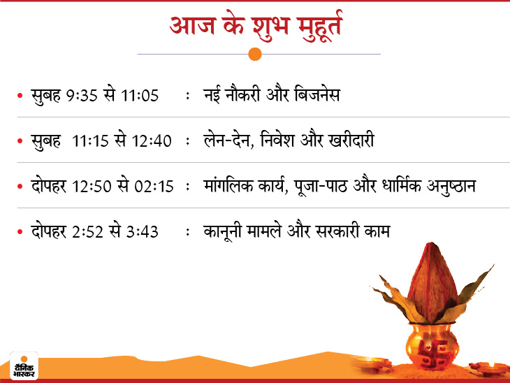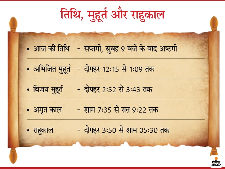 आज सप्तमी सूर्योदय से करीब 4 घंटे तक रहेगी। इसके बाद अष्टमी तिथि पूरे दिन रहेगी। इसे जया तिथि कहा जाता है। इसमें कोई भी काम करने से जीत और सफलता मिलती है। मुहूर्त की बात करें तो आज अभिजित मुहूर्त, विजय मुहूर्त और अमृत काल में कोई भी शुभ काम किया जा सकता है। लेकिन राहुकाल में किसी भी तरह का शुभ काम नहीं करना चाहिए।